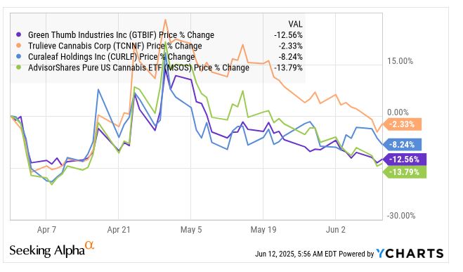 MSOS is leading the way lower, and all are down, while the Global Cannabis Stock Index has rallied 6.4% so far in Q2. I am not trying to get convince anyone to sell the MSOs or MSOS today, but I remain cautious. 280E taxation remains in place and does not appear to be going away. I am especially cautious on these three largest positions in MSOS.