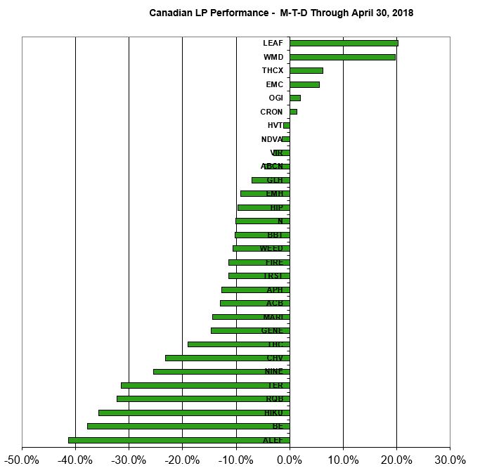 After rallying to begin the year, the index has now declined 14.2% thus far in 2018. The intraday lows on both April 4th and April 10th were close to 800, and the index bounced above that level in late April. News flow was light in April for the sector, with finalized allotments from Quebec provided on April 11th. Health Canada issued 13 new licenses, bringing the total to 104. Hiku Brands (CSE: HIKU) (OTC: DJACF) announced an all-stock deal to acquire WeedMD (TSXV: WMD) (OTC: WDDMF).