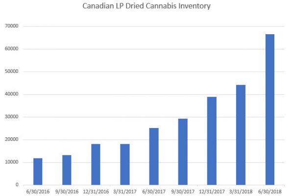 A big change in the data was the amount of inventory held by licensed producers, with dried flower growing 50.3% from the prior quarter and 164.8% from a year ago to 66,404 Kg. LPs held 32,513 liters of cannabis oil in inventory, up 106.7% from the prior quarter.