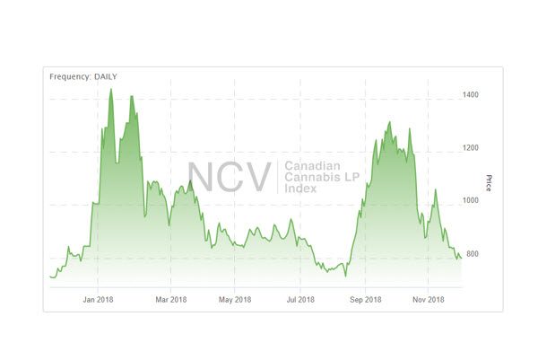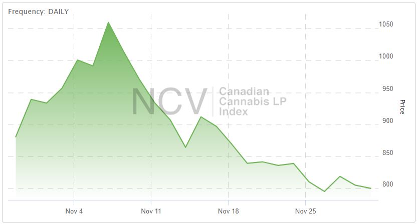 After sinking more than 25% in October, the Canadian Cannabis LP Index declined another 14.8% in November to 799.72:
