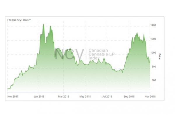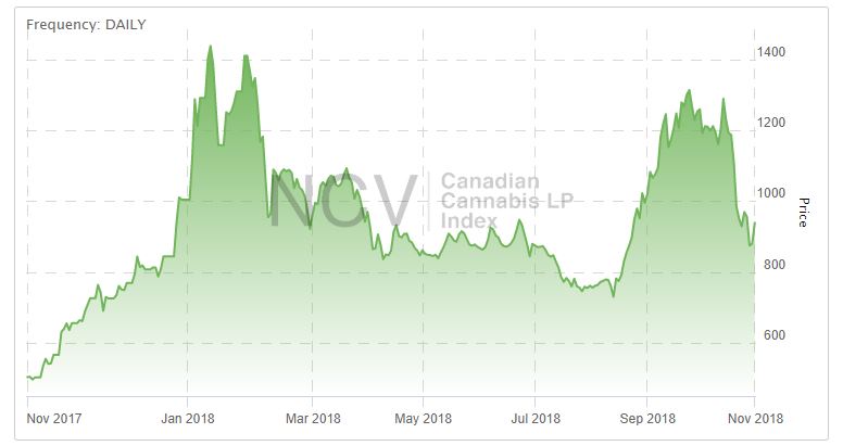 After extending upon September’s spectacular gains of 22.6% into mid-month and testing the highs from early 2018, the Canadian Cannabis LP Index sank 25.1% in October to 939.04: