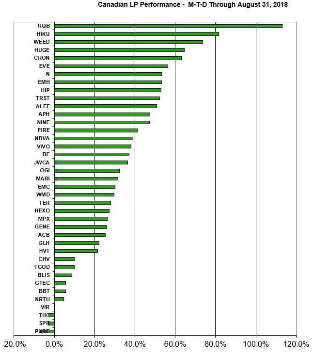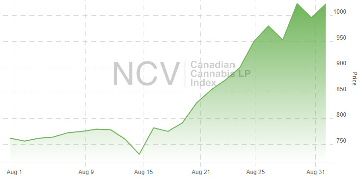 After plunging 13% in July and then extending the correction that began in January into mid-August, Canadian cannabis producers rallied sharply in the back half of the month, with the Canadian Cannabis LP Index increasing 34.2% for the entire month to 1022.02: