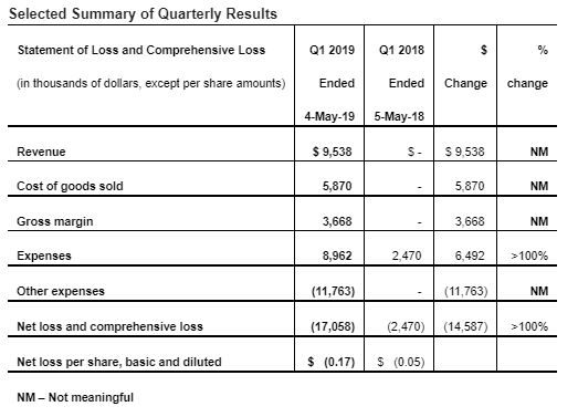 During the thirteen weeks ended May 4, 2019, the Company generated revenue of $9.5 million including cannabis and cannabis-related accessory sales of $9.0 million and digital development revenue of $0.5 million. Revenues are expected to continue to increase as the Company acquires new licences and opens additional retail cannabis stores, subject to the issuance of new licenses and the entry of the Company into markets that permit private cannabis retail stores.