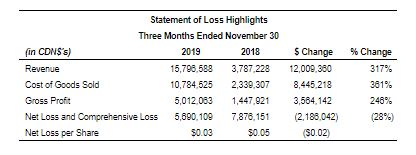 Financial and Operational Highlights for the Quarter Ended November 30, 2019: