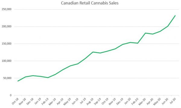 Drivers of growth include the expansion of stores in BC and especially Ontario, the success in value-priced flower and the roll out of next-generation products, especially vapes. The buying ahead of the pandemic in March appears to have impacted the sequential growth patterns, with July finally showing robust growth that had been lacking in May (+4%) and June (+8%):