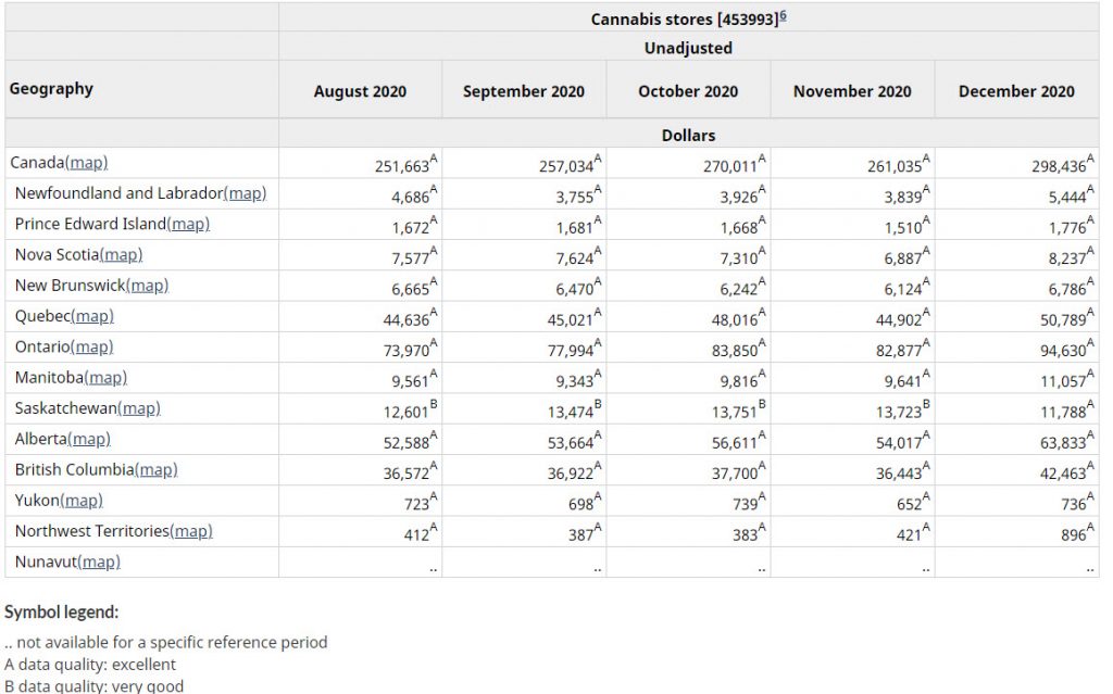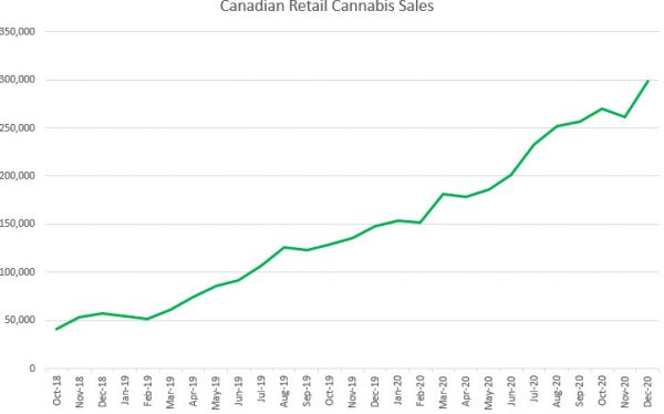 Statistics Canada released December retail sales for the country this morning, with cannabis sales growth increasing sequentially. Sales of C$298.4 million rose 14.3% from November, which had fallen 3% from October levels, and rose 102% from a year ago. In November, year-over-year growth had slowed below 100% for the first time, gaining 93%. For all of 2020, cannabis sales increased 121% to $2.62 billion.