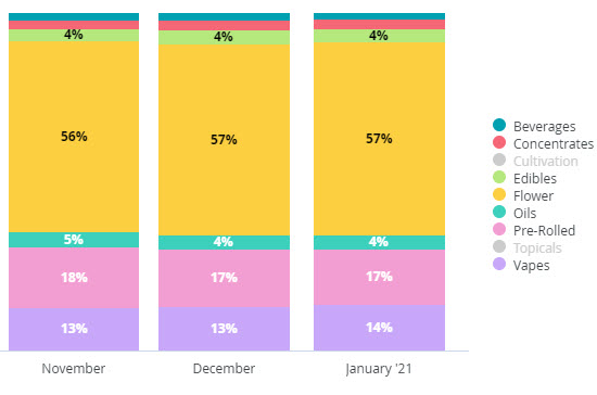 Hifyre IQ estimated that product categories have been stable, with a slight decrease in pre-rolls towards flower. Flower and pre-rolls represent, according to Hifyre IQ data, 74% of the market.