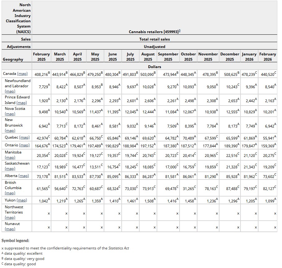 Statistics Canada released February retail sales for the country, with cannabis sales decreasing from the January levels, down 7.9% to C$440.5 million from the prior month. The sequential decrease was up 2.0% on a per-day basis more due to the fewer days than in the prior month. January, originally reported at C$466.1 million, was revised higher to C$478.2 million. The sales in February were up 7.9% from a year ago, down from the level last month at 9.4% and in May at 8.3% and 7.5% in June but better than the prior lowest annual growth rate since legalization commenced of -0.9% in September 2024 due to the BC strike. In 2024, total sales increased 4.5% to C$5.39 billion, and they were up 4.1% in 2025 to C$5.62 billion. So far in 2026, sales are up 8.6%.