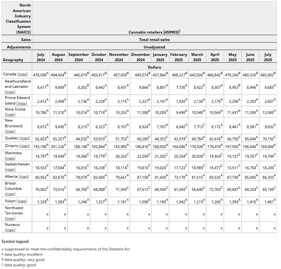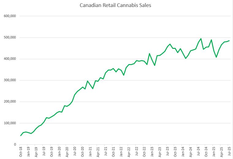 Statistics Canada released July retail sales for the country, with cannabis sales increasing from the June levels, up 1.0% to C$485.0 million. This sequential growth was down on a per-day basis due to the extra day in the prior month. June, originally reported at C$480.2 million, was revised slightly higher to C$480.3 million. The sales in July were up 1.4% from a year ago, down from the level in May at 8.3% and from 7.5% in June. This was also down from the 20.3% August 2023 growth rate and above the prior lowest annual growth rate since legalization commenced of -0.9% in September 2024, and it was down substantially from the December growth of 9.1%. In 2024, total sales increased 4.5% to C$5.39 billion, and they are up 4.9% so far in 2025.