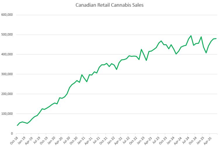 Statistics Canada released June retail sales for the country, with cannabis sales increasing from the May levels, up 0.2% to C$480.2 million. This sequential growth was better on a per-day basis due to the extra day in the prior month. May, originally reported at C$485.4 million, was revised slightly lower to C$479.3 million. The sales in June were up 7.4% from a year ago, down from the strongest annual growth since November 2023 in May. This was also down from the 20.3% August 2023 growth rate and above the prior lowest annual growth rate since legalization commenced of -0.9% in September 2024, and it was down somewhat from the December growth of 9.1%. In 2024, total sales increased 4.5% to C$5.39 billion, and they are up 5.5% so far in 2025.