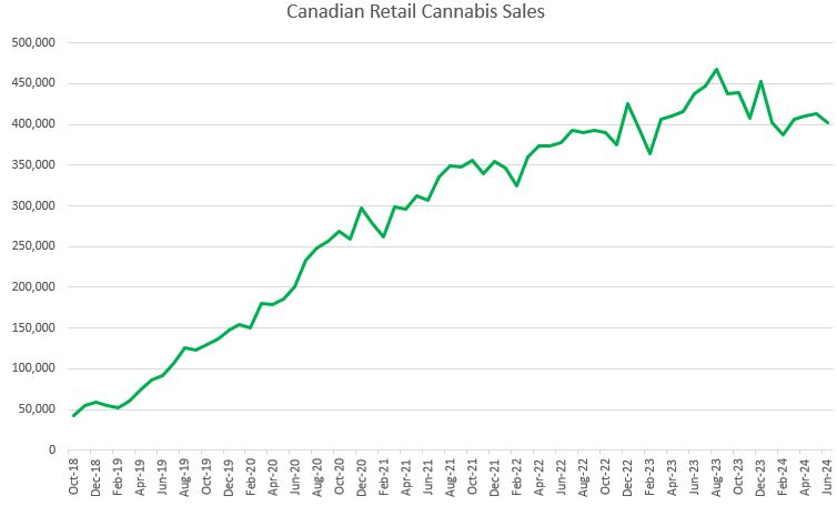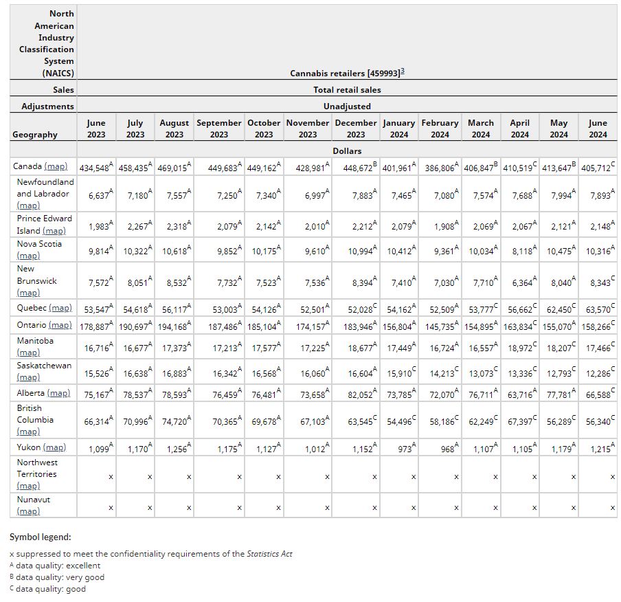 Statistics Canada released June retail sales for the country, with cannabis sales decreasing from the May levels, down 1.9% to C$405.7 million. On a per-day basis, sales sales increased 1.4%. May, originally reported at C$434.5 million, was revised much lower to C$413.6 million. The sales were down 7.3% from a year ago. This was down from the 19.8% August growth rate and below the prior lowest annual  growth rate (flat in April 2024 and down 0.5% in May after being revised lower) since legalization commenced.  In 2023, total sales increased 12.5% to C$5.09 billion, and in 2024 they have decreased 0.2% from a year ago.