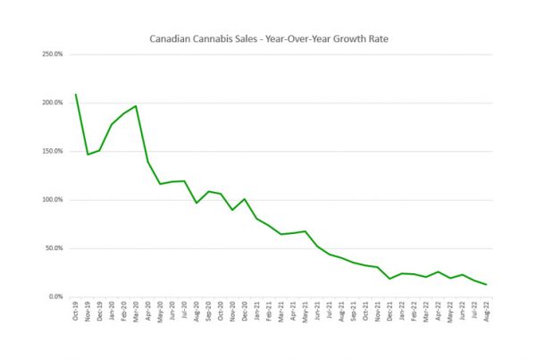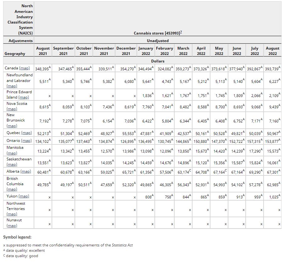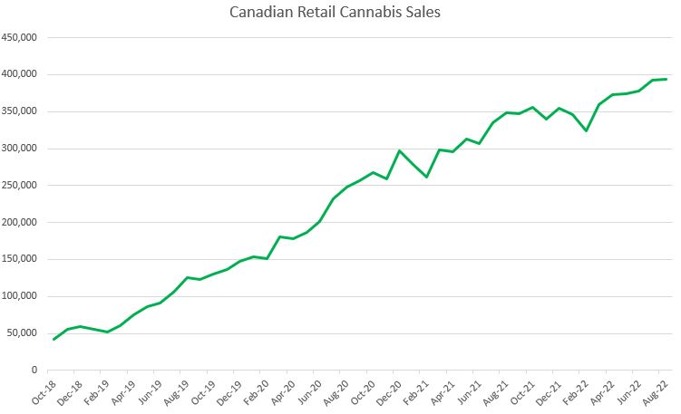 Statistics Canada released August retail sales for the country, with cannabis sales increasing from July by 0.2% to C$393.7 million. July was revised from C$394.8 million to C$392.9 million. The sales were up 13.0% from a year ago, down from the 17.2% July growth rate. The growth was the lowest since legalization began.