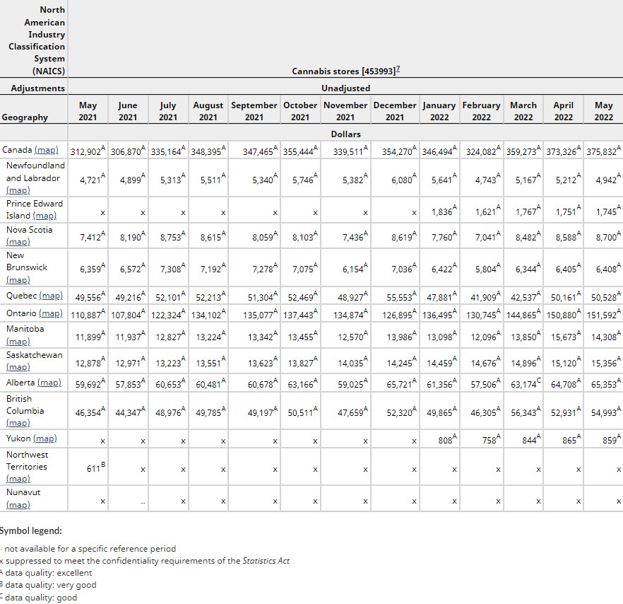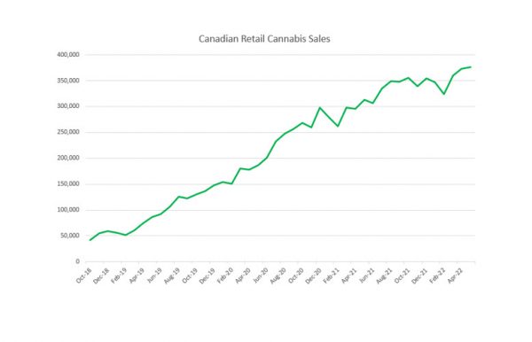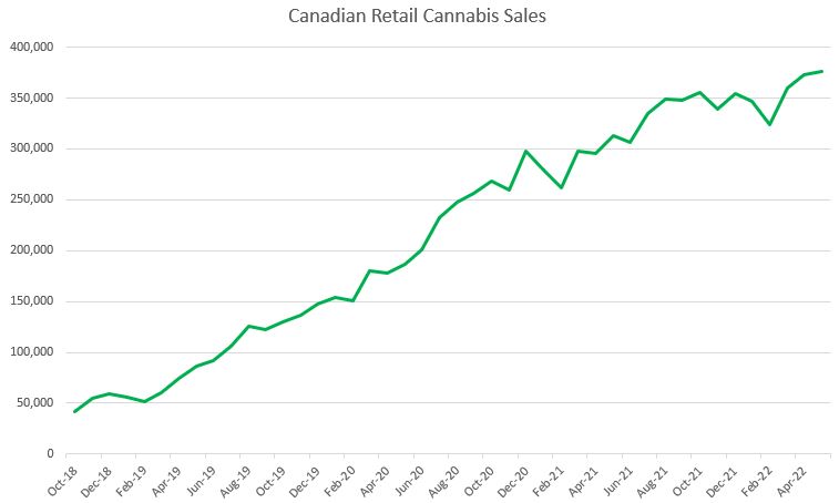 Statistics Canada released May retail sales for the country, with cannabis sales increasing from April by 0.7% to C$375.8 million. April was revised from C$372.4 million to C$373.4 million. The sales were up 20.1% from a year ago, down from the 26.1% April growth rate and near the lowest annual growth rate of 19.2% in December: