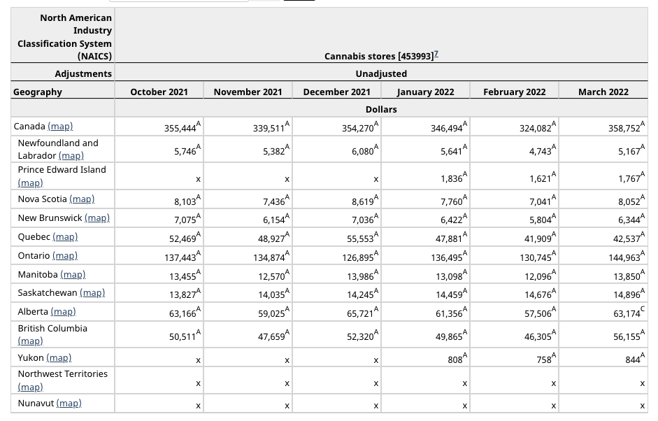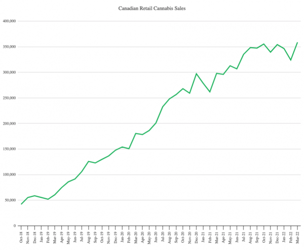 Statistics Canada released March retail sales for the country, with cannabis sales increasing from February by 10.7% to C$358.8 million. February was revised from C$336.4 to C$324.1. The sales were up 20.4% from a year ago, down from the 23.8% February growth rate: