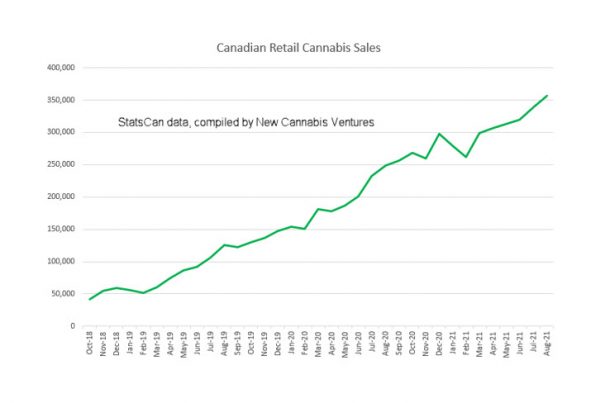 Statistics Canada released August retail sales for the country this morning, with cannabis sales increasing from July by 5% to C$356.9 million, a record high. The record sales were up 43.8% from a year ago, the lowest annual growth to date and down from 45.6% in July.