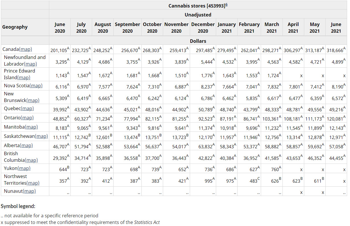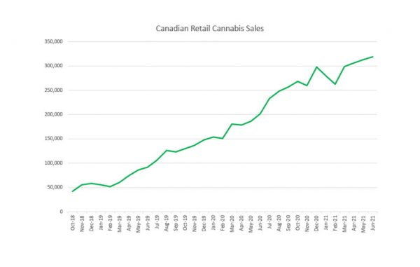 Statistics Canada released June retail sales for the country this morning, with cannabis sales increasing from May despite one less day. Sales of C$318.7 million, a record high, rose 2% from May, similar to the sequential gains in April and May. The record sales were up 58.5% from a year ago, the lowest annual growth to date and down from 68.1% in May.