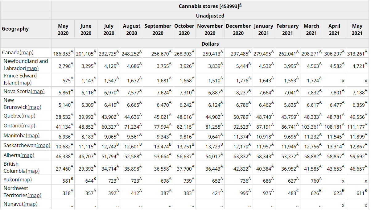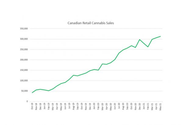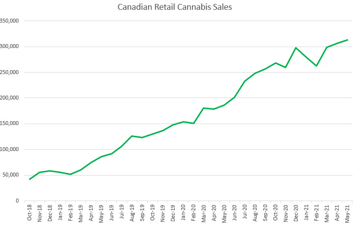 Statistics Canada released May retail sales for the country this morning, with cannabis sales increasing from April, which had one less day. Sales of C$313.3 million, a record high, rose 2% after a 3% increase in April that followed a 14% gain in March and increased 68.1% from a year ago, slightly worse than the 71.7% year-over-year growth in April.
