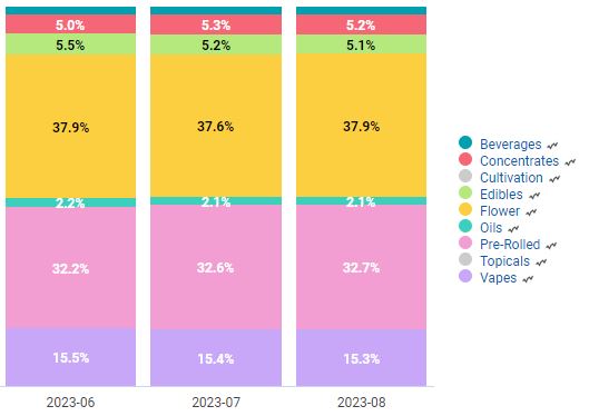 Hifyre IQ had forecast July sales at C$448.3 million based upon its data, so this was slightly below the estimate. The data analytics provider has been estimating August sales to be 0.9% higher, which would be 1.4% above the actual actual July level and up 16.0% from a year ago, based upon its data. Hifyre estimates sales outside of flower and pre-rolls at 29.8% in July and 29.4% in August.