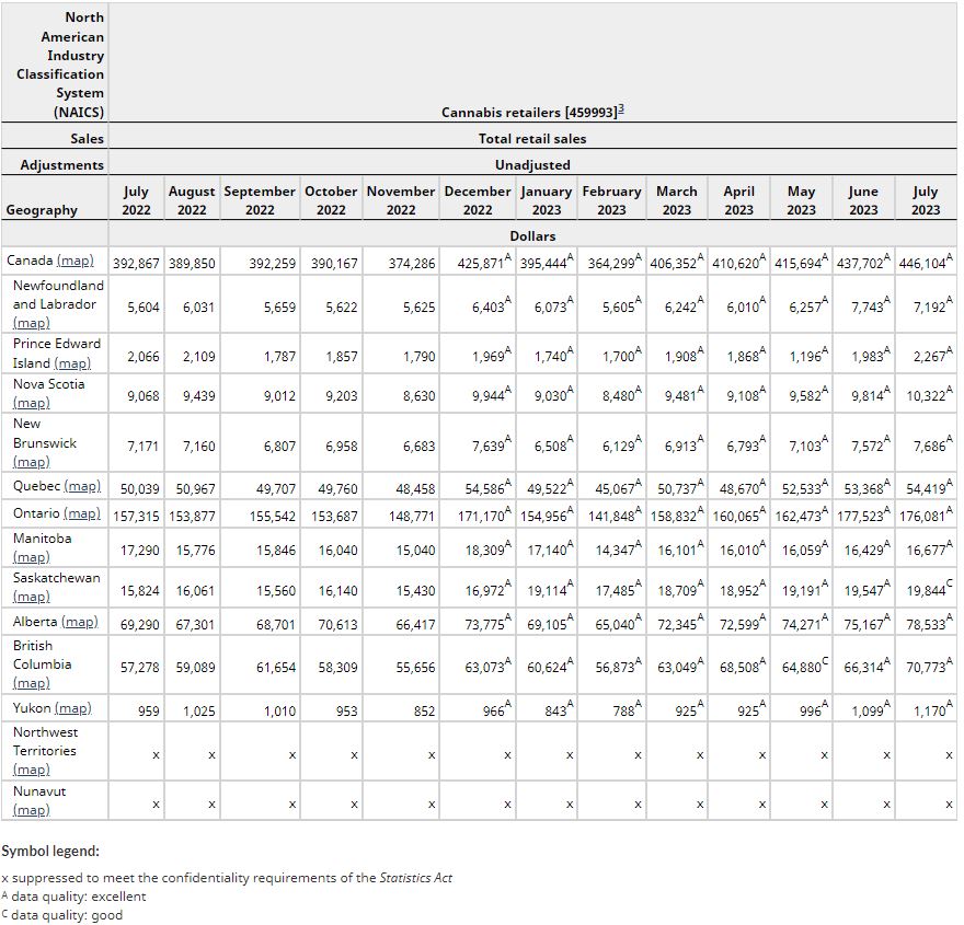 Statistics Canada released July retail sales for the country, with cannabis sales rising from the strong June levels, up 1.9% to C$446.1 million, another new record for a month. June was revised higher to C$437.7 million. The sales, which fell 1.4% on a per-day basis, were up 13.6% from a year ago, down from the 15.8% June growth rate. In 2022, total sales increased 17.9% to C$4.52 billion, and they have increased 12.9% during the first seven months of 2023.