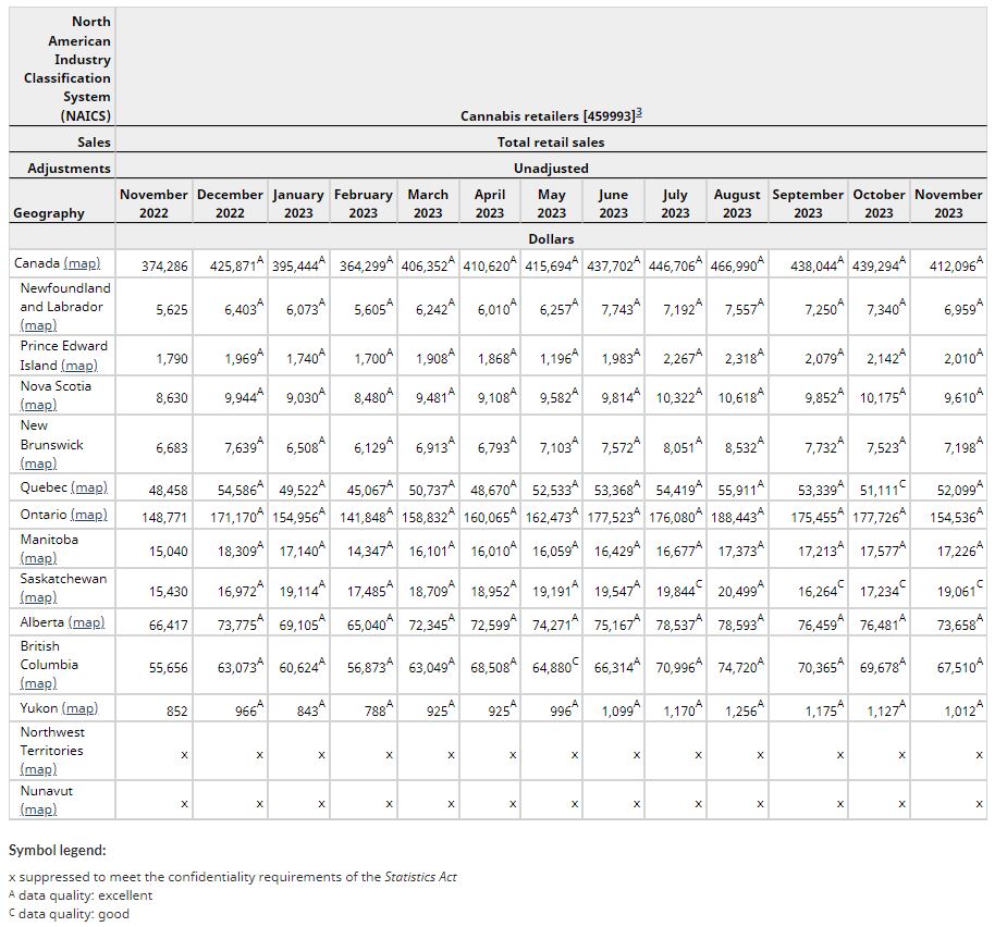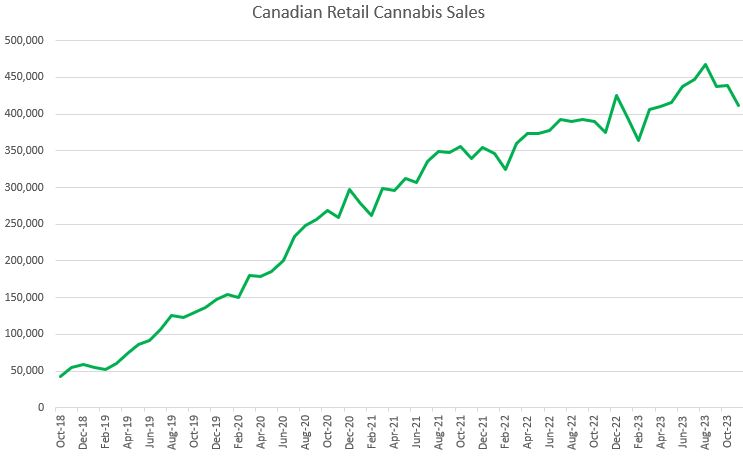 Statistics Canada released November retail sales for the country, with cannabis sales decreasing from the strong October levels, down 6.2% to C$412.1 million. October was revised lower to C$439.3 million. The sales, which fell 3.1% on a per-day basis, were up 10.1% from a year ago, down from the 19.8% August growth rate and the lowest annual growth rate since October 2022. In 2022, total sales increased 17.9% to C$4.52 billion, and they have increased 13.2% during the first ten months of 2023.