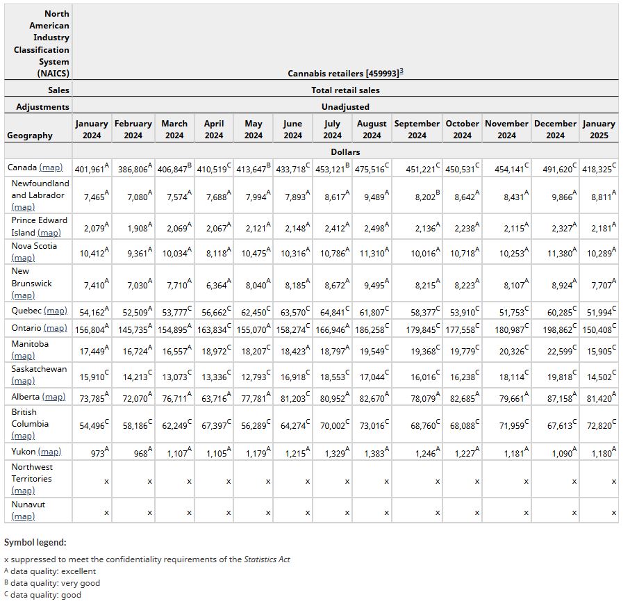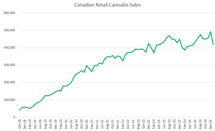 Statistics Canada released January retail sales for the country, with cannabis sales decreasing from the December levels, down 14.9% to C$418.3 million. December, originally reported at C$499.4 million, was revised lower to C$491.6 million. The sales in January were up 4.1% from a year ago. This was down from the 20.3% August 2023 growth rate and above the prior lowest annual growth rate since legalization commenced of -2.8% in May, but it was down sharply from the December growth of 9.6%. In 2024, total sales increased 1.5% to C$5.24 billion.