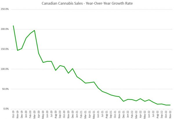 Statistics Canada released November retail sales for the country, with cannabis sales decreasing from October sharply to C$373.3 million. The growth per-day slowed, as November has one less day than October. October was revised from C$389.2 million to C$390.2 million. The sales were up 9.9% from a year ago, up from the reported 9.5% October growth rate that was revised to 9.8%. In 2022, total sales have increased 17.6% compared to the first 11 months of 2021 to C$4.09 billion.