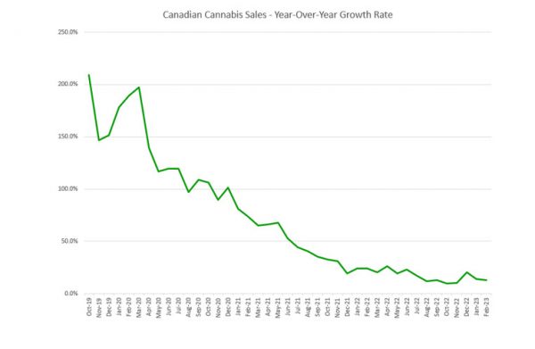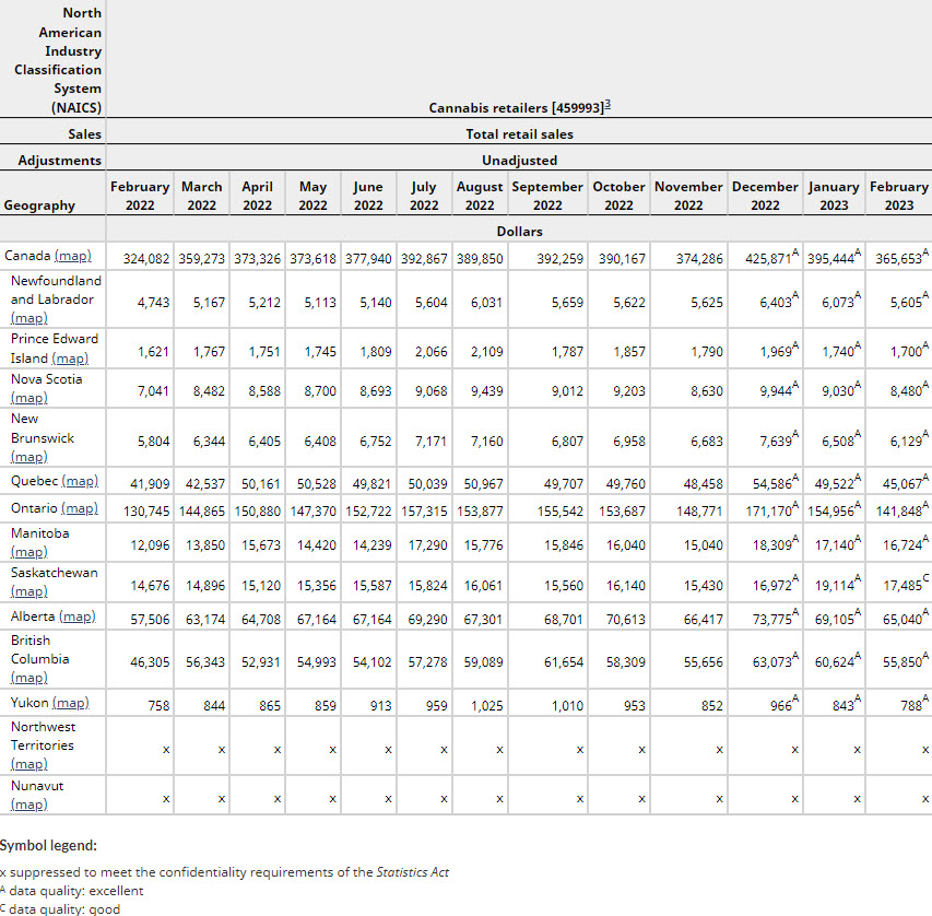 Statistics Canada released February retail sales for the country, with cannabis sales falling from the January levels, down 7.5% to C$365.7 million. January was revised slightly to C$395.4 million. The sales, which rose 2.4% on a per-day basis, were up 12.8% from a year ago, down from the reported 14.1% January growth rate. In 2022, total sales increased 17.9% to C$4.52 billion, and they have increased 13.5% thus far in 2023.