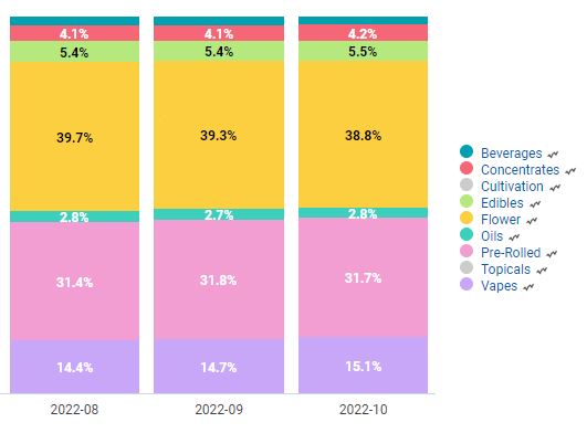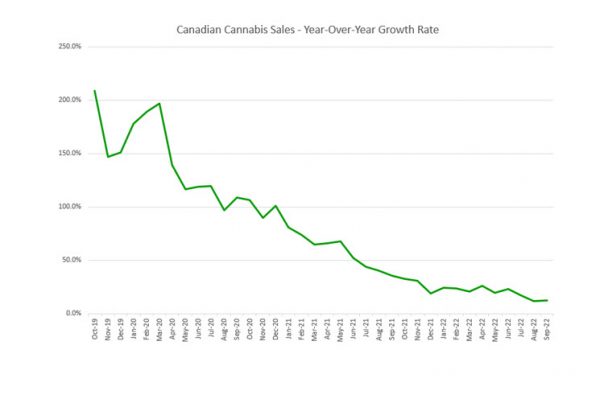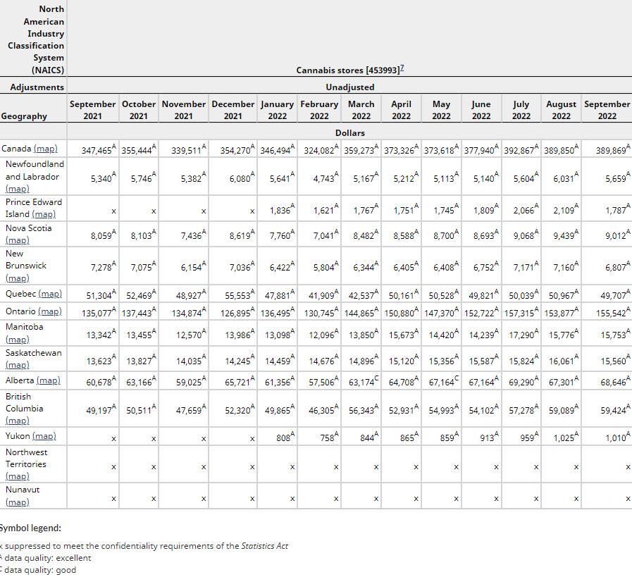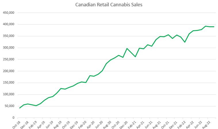 Statistics Canada released September retail sales for the country, with cannabis sales increasing from August marginally to C$389.9 million. August was revised from C$393.7 million to C$389.9 million. The sales were up 12.2% from a year ago, down from the reported 13.0% August growth rate that was revised to 11.9%, the lowest since legalization began. In 2022, total sales have increased 19.5% compared to the first nine months of 2021 to C$3.3 billion.