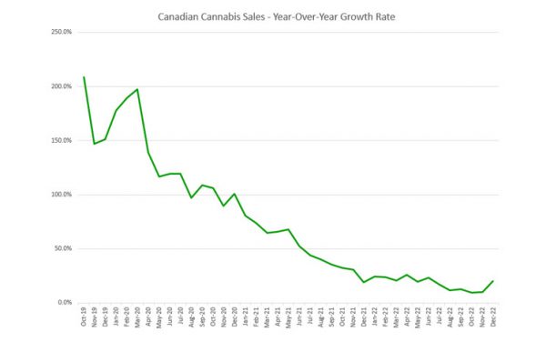 Statistics Canada released December retail sales for the country, with cannabis sales increasing from November sharply to a record C$425.9 million, up 13.8%. November was revised from C$373.3 million to C$374.3 million. The growth per-day increased by 10.1%. The sales were up 20.2% from a year ago, up from the reported 9.9% November growth rate that was revised to 10.2%. In 2022, total sales increased 17.9% to C$4.52 billion.