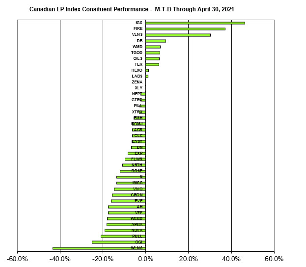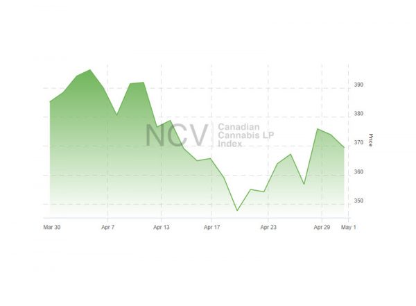 The Canadian Cannabis LP Index pulled back slightly in April, its second straight decline after a strong first two months to begin the year, declining 4.9% to 369.45: