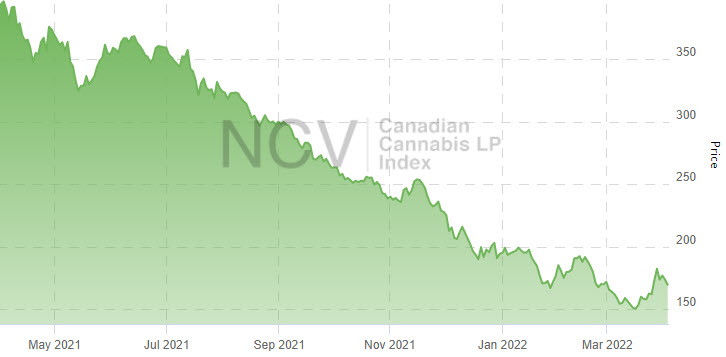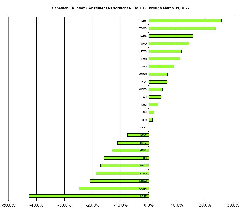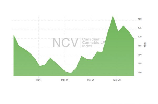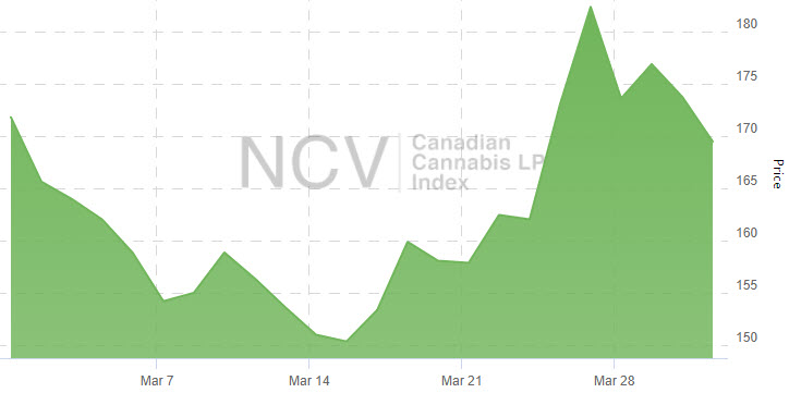 The Canadian Cannabis LP Index fell for the ninth consecutive month, declining 1.4% to 169.46 in March: