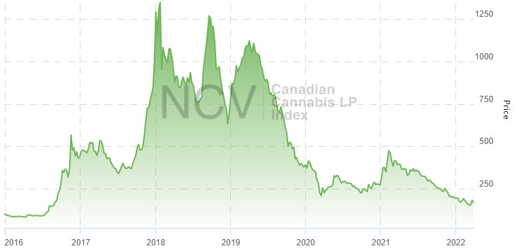 It remains substantially below the all-time closing high of 1314.33 in September 2018, just ahead of Canadian adult-use legalization. The index, which trades below its March 2020 closing low, has lost 87.1% since that all-time high but has lifted 12% since setting a 2022 closing low on March 15th at 150.39 :