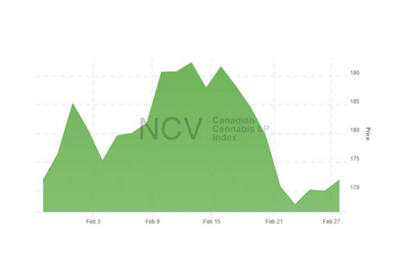 After retreating 26% in Q4, the Canadian Cannabis LP Index extended its losing streak to seven months in January, declining 9.5% to 176.42. In February, the pace of the decline slowed, but the index has now fallen eight straight months, losing 2.6% in February to 171.79: