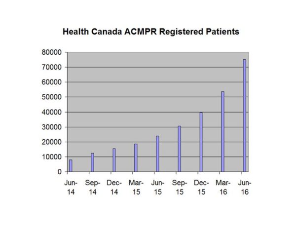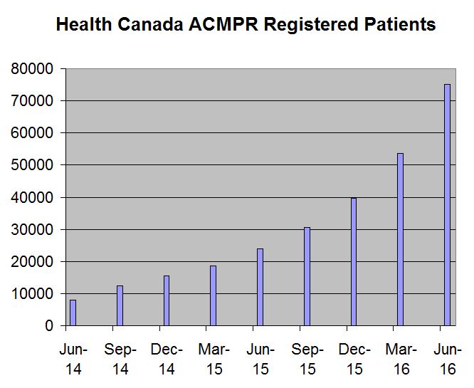 After what seems like an unacceptably long delay, Health Canada, which oversees the Canadian medical cannabis program, ACMPR, reported data for the quarter ending 06/30/16 on Friday. The number of patients enrolled in the program grew 40.1% from the prior quarter to 75,166. This represented growth of 214% from a year ago and an acceleration from the 35.2% sequential growth reported in the prior quarter. The quarter represented the largest single patient addition since the inception of the program on 4/1/14 and further demonstrated that program continues to see rapid enrollment.