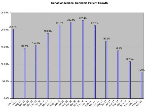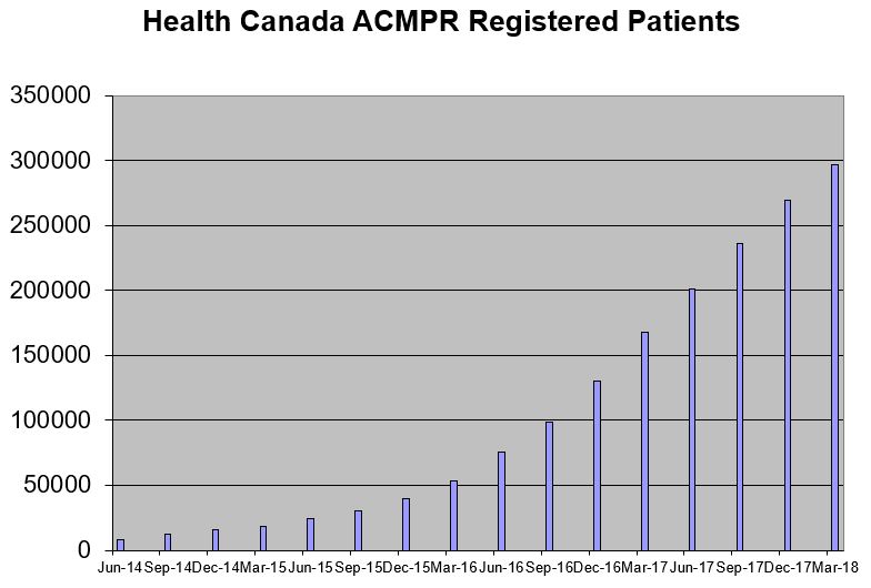 Health Canada released monthly data today on its medical cannabis program, Access to Cannabis for Medical Purposes Regulations (ACMPR), which was implemented as MMPR in April 2014. The number of patients as of March 31, 2018 increased to 296,702 from 269,502 at the end of December and 167,754 as of March 31, 2017, representing quarterly growth of 10.1% and annual growth of 76.9%: