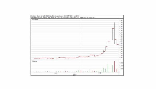 What has been most remarkable about the run in CNBX is that the dollar-volume of trading exceeded $92mm on Tuesday and Wednesday as traders jumped aboard. The stock is extending the reversal today following the revelation that OTC Markets reached out to the company regarding trading in the stock, according to the company’s press release issued before the market opened.