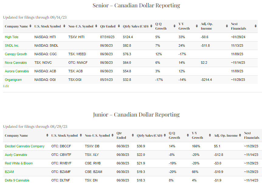 At the time of our last update on August 20th, 35 companies qualified for inclusion on the senior list, including 28 filing in U.S. dollars and 7 in the Canadian currency. Currently, 29 companies that file in U.S. dollars qualify and 6 that file in Canadian dollars are qualifying for the senior lists, a total still of 35. The junior list now includes 12 companies reporting in U.S. dollars and 5 in Canadian dollars. On a combined basis, the Public Cannabis Company Revenue & Income Tracker now includes 52 companies. Since late August, Fire & Flower, which went bankrupt and was liquidated, was removed from the senior list in Canada. In America, StateHouse (CSE: STHZ) (OTC: STHZF) moved from the junior list to the senior list, and POSaBit (CSE: PBIT) (OTC: POSAF) returned to the junior list.