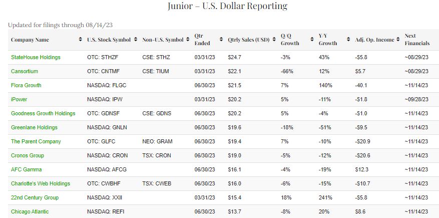 At the time of our last update on July 28th, 34 companies qualified for inclusion on the senior list, including 27 filing in U.S. dollars and 7 in the Canadian currency. Currently, 28 companies that file in U.S. dollars qualify and 7 that file in Canadian dollars are qualifying for the senior lists, a total of now 35. The junior list now includes 12 companies reporting in U.S. dollars and 5 in Canadian dollars. On a combined basis, the Public Cannabis Company Revenue & Income Tracker now includes 52 companies.