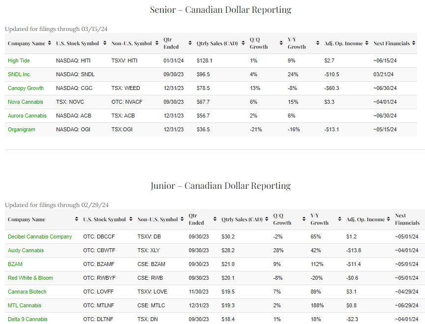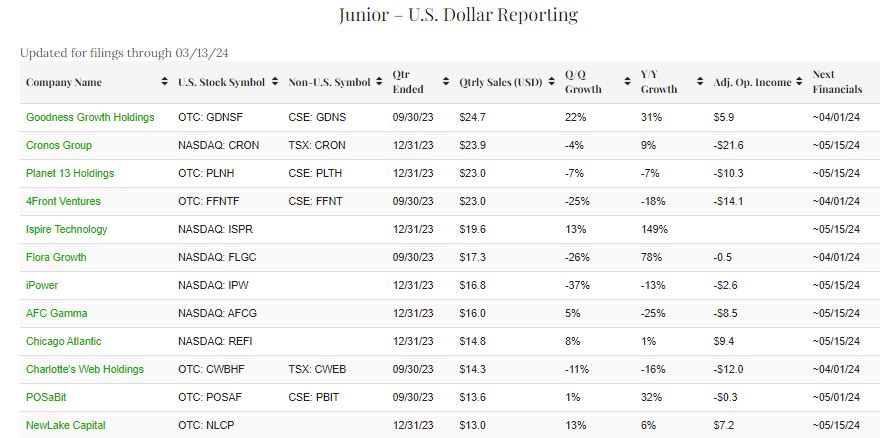 At the time of our last update on February 25th, 34 companies qualified for inclusion on the senior list, including 28 filing in U.S. dollars and 6 in the Canadian currency. Currently, 28 companies that file in U.S. dollars qualify and 6 that file in Canadian dollars are qualifying for the senior lists, a total of still 34. The junior list now includes 12 companies reporting in U.S. dollars and 7 in Canadian dollars. On a combined basis, the Public Cannabis Company Revenue & Income Tracker now includes 53 companies. Since late February, we added NewLake Capital (OTC: NLCP) to the American junior list.