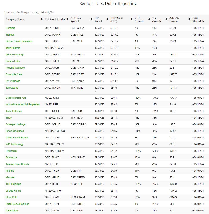 Most of the companies with years ending in December have already reported. 7 MSOs with quarterly revenue in excess of $100 million saw revenue grow on average by just 4% from a year ago. Cresco Labs (OTC: CRLBF) (CSE: CL) did better than expected, but its growth was the weakest. Trulieve (OTC: TCNNF) (CSE: TRUL), which has seen its stock more than double so far in 2024, experienced a decline from a year ago in its revenue too. Ascend Wellness (OTC: AAWH) (CSE: AAWH) saw the strongest year-over-year growth at 25%. Analysts have reduced their estimates for 2024 and 2025 for many of these companies.
