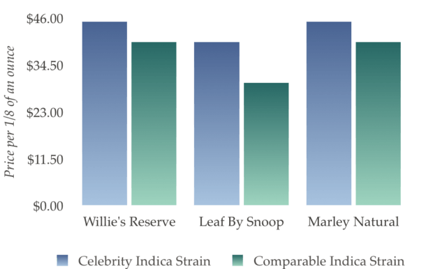 Despite the sleek, professional branding of celebrity products, the price points are only slightly higher than comparable strains sold in the same dispensaries. Price points for celebrity-branded products are approximately 17% higher than comparative products across the board, based on a weighted average of prices for strains, concentrates, and edibles from Leafs by Snoop, Marley Natural, and Willie’s Reserve. Customers end up paying between $.09 and $.17 more per serving of flower for a celebrity-branded product.[1]