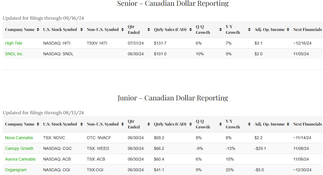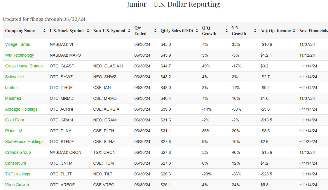 At the time of our last update on August 12th, 19 companies qualified for inclusion on the senior list, including 17 filing in U.S. dollars and 2 in the Canadian currency, and the junior list had 18 companies. Now, 17 companies that file in U.S. dollars and 2 that file in Canadian dollars are qualifying for the senior lists, a total still of 19. The junior list includes 14 companies reporting in U.S. dollars and 4 in Canadian dollars. On a combined basis, the Public Cannabis Company Revenue & Income Tracker now includes 37 companies.