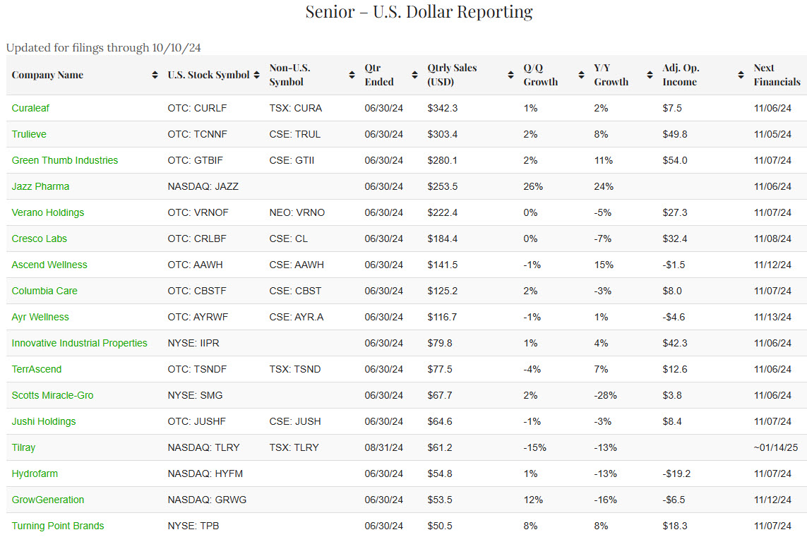 This data-driven, fact-based tracker will continually update based on new financial filings so that readers can stay up to date. Companies must file with the SEC or SEDAR and be current to be considered for inclusion. When we launched this resource in May 2019, companies with quarterly revenue in excess of US$2.5 million qualified. As the industry has scaled and as more companies have gone public, we have raised the minimum several times subsequently, including a move to US$5 million in October 2019, to US$7.5 million in June 2020, to US$10 million in November 2020, US$12.5 million in August 2021 and US$25 million in September 2021. Due to the rapid growth in the cannabis industry, we raised the minimum again in May 2024. The senior list has a minimum of US$50 million (C$69.5 million), and the junior list now has a minimum of US$25 million (C$34.8 million).