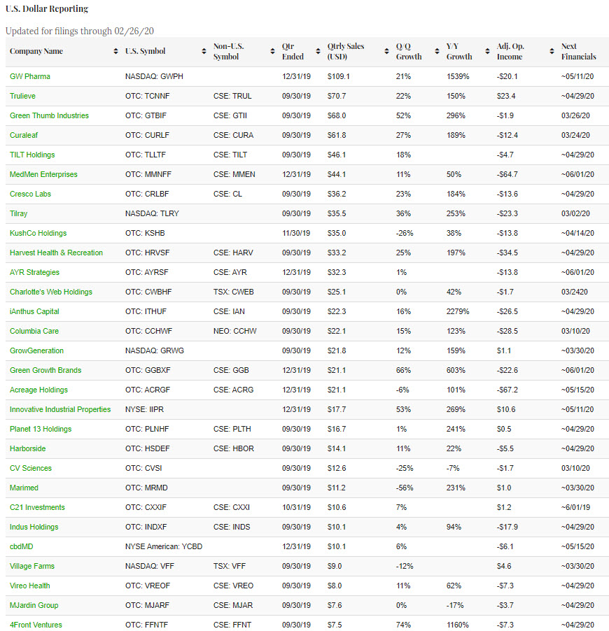 The Public Cannabis Company Revenue & Income Tracker, managed by New Cannabis Ventures, ranks the top revenue producing cannabis stocks that generate industry sales of more than US$7.5 million per quarter (C$9.9 million). This data-driven, fact-based tracker will continually update based on new financial filings so that readers can stay up to date. Companies must file with the SEC or SEDAR to be considered for inclusion. Please note that we raised the minimum quarterly revenue in May from US$2.5 million and from US$5.0 million in October.