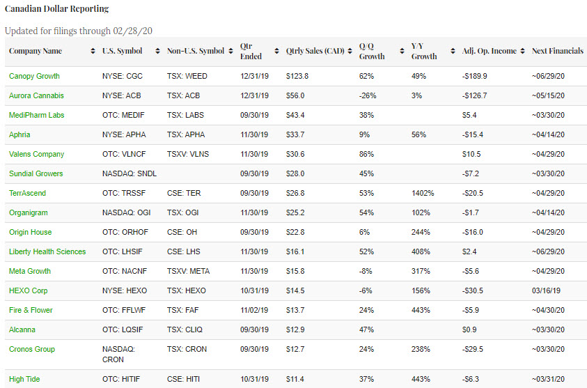 For companies that report in U.S. dollars, Acreage Holdings (CSE: ACRG) (OTC: ACRGF), AYR Strategies (CSE: AYR) (OTC: AYRSF), cbdMD (NYSE American: YCBD), Green Growth Brands (CSE: GGB) (OTC: GGBXF), GW Pharma (NASDAQ: GWPH), Innovative Industrial Properties (NYSE: IIPR) and MedMen Enterprises (CSE: MMEN) (OTC: MMNFF) provided updated financials during March. The theme appeared to be growing revenue but expanding operating losses, though there were exceptions. Acreage Holdings reported a sequential decline in revenue in Q4 and experienced a substantially higher operating loss that exceeded $67 million. The company attributed the decline to a “an opportunistic wholesale transaction in Massachusetts during third quarter, which did not repeat in the fourth quarter.” It also cited regulatory delays in opening new stores. AYR Strategies saw Q4 revenue grow 1% sequentially as its operating loss expanded, and it provided guidance for 2020 that it expects to achieve revenue in excess of $207 million with adjusted EBITDA greater than $93 million. cbdMD grew revenue by 6% sequentially in fiscal Q1 but also saw its operating loss expand. Green Growth Brands fiscal Q2 revenue grew 12% sequentially, but the operating loss didn’t improve despite a better gross margin. The company will be selling 80% of its CBD business, which accounted for half the revenue. GW Pharma remained at the top of the list as its Q4 revenue of $109 million was slightly higher than the $108 million noted in its pre-announcement. Despite the 21% advance in revenue from Q3, the operating loss expanded by 14%. Cannabis REIT Innovative Industrial Properties posted a very strong report for its Q4, with revenue expanding 53% sequentially as its operating income grew 56%. Finally, while MedMen’s fiscal Q2 revenue grew 11% from Q1, the operating loss expanded 46% despite a reduction in corporate SG&A due, in part, to an accounting adjustment to its cost of goods sold.