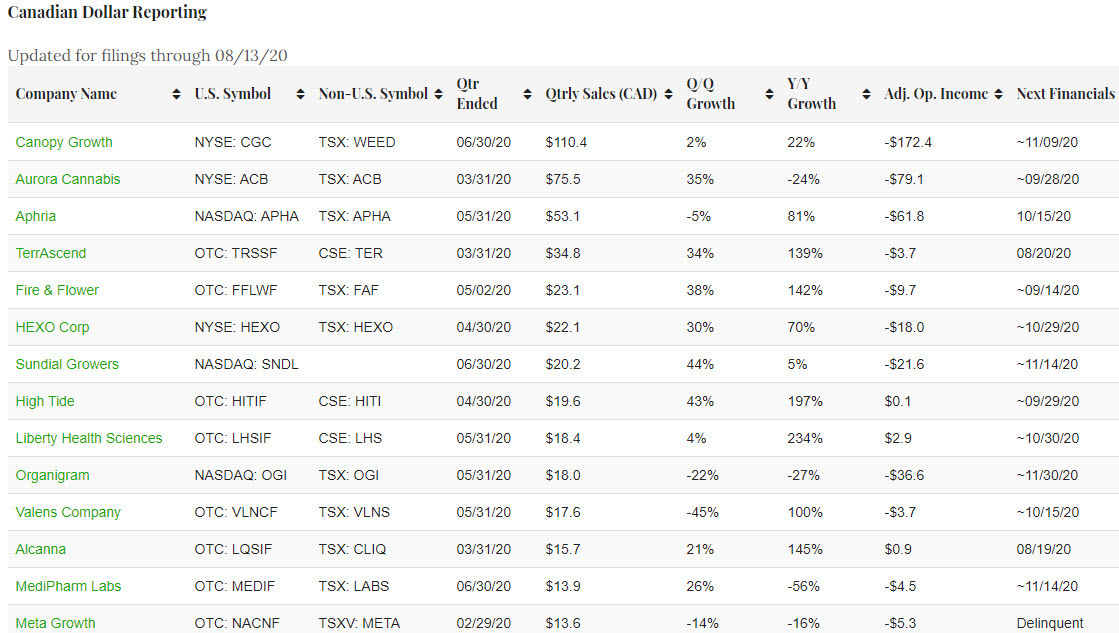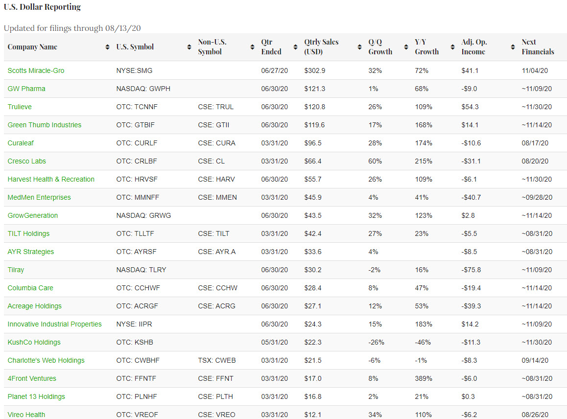 35 companies currently qualify for inclusion, with 21 filing in U.S. dollars and 14 in the Canadian currency, which is up from the 34 when we reported at the end of July. In the U.S., we added cbdMD (NYSE American: YCBD). In Canada, we added MediPharm Labs (TSX: LABS) (OTC: MEDIF) and removed Aleafia Health (TSX: ALEF) (OTCD: ALEAF). Some companies have taken advantage of revised filing deadlines that have been extended due to the pandemic, and we expect to continue to see some delays. We also expect to add a few names to the rankings over the balance of this reporting season and the rest of the year.