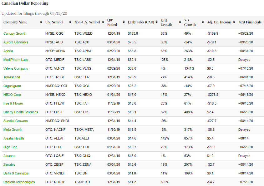 In May 2019, we added an additional metric, “Adjusted Operating Income”, as we detailed in our newsletter. The calculation takes the reported operating income and adjusts it for any changes in the fair value of biological assets required under IFRS accounting. We believe that this adjustment improves comparability for the companies across IFRS and GAAP accounting. We note that often operating income can include one-time items like stock compensation, inventory write-downs or public listing expenses, and we recommend that readers understand how these non-cash items can impact quarterly financials. Many companies are moving from IFRS to U.S. GAAP accounting, which will reduce our need to make adjustments. Please note that our rankings include only actual reported revenue, and not pro forma revenue.