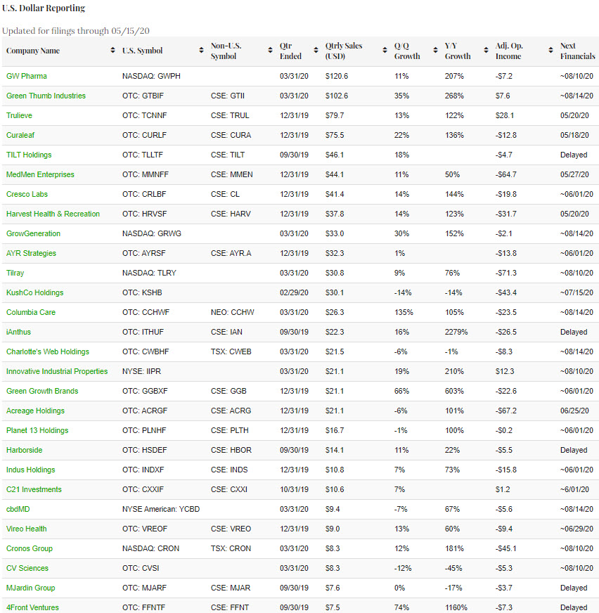 46 companies currently qualify for inclusion, with 28 filing in U.S. dollars and 18 in the Canadian currency, which is up two from when we reported in early May. Cronos Group (TSX: CRON) , which reports in U.S. dollars, and Aleafia Health (TSX: ALEF) (OTC: ALEAF), which reports in Canadian dollars, joined the list. Several companies that had been expected to report by the end of April or mid-May have taken advantage of an extended deadline to accommodate delays due to the COVID-19 crisis, including five that report in U.S. dollars and three that file in Canadian dollars. We expect some additional delays as well.