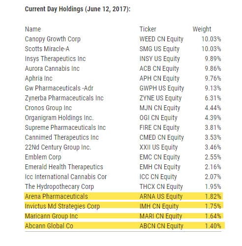 ABcann Global (TSXV: ABCN) (OTC: ABCCF) and Maricann Group (CSE: MARI) (OTC: MRRCF) are both newly trading LPs, while Invictus MD Strategies (TSXV: IMH) (OTC: IVITF) has been trading for a couple of years but became an LP only recently following its acquisition of Acreage Farms. Arena Pharmaceuticals (NASDAQ: ARNA) is a biotech that seems to be an odd choice, as it isn’t developing any drugs using cannabinoids but rather one that targets the CB2 receptor. To make room for the new additions, Horizons reduced Insys (NASDAQ: INSY) and Zynerba (NASDAQ: ZYNE).