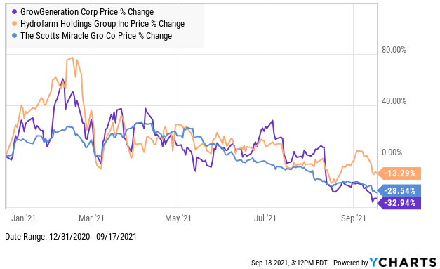 In all cases, valuations have dropped considerably. For GrowGeneration, the forward EV/Sales ratio has declined 63%, while its EV/EBITDA has dropped 66%. The forward PE, similarly, has fallen 56%. Hydrofarm’s same ratios have dropped 34%, 68% and 73%, respectively. The valuation ratios for Scotts Miracle-Gro have declined 32%, 27% and 33%, respectively.